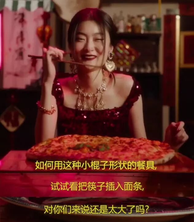 宣传片里充满着对东方文化的误解和贬低,模特用奇怪的姿势,使用筷子吃所谓的“意大利美食”: