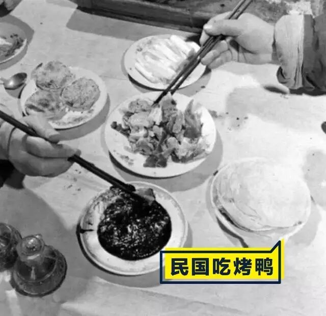 ▲ 民国的烤鸭餐桌,可见烤鸭、荷叶饼、空心烧饼、酱、葱