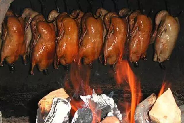 全聚德是挂炉烤法,点燃果木,以明火赤裸裸地把鸭子烤熟。