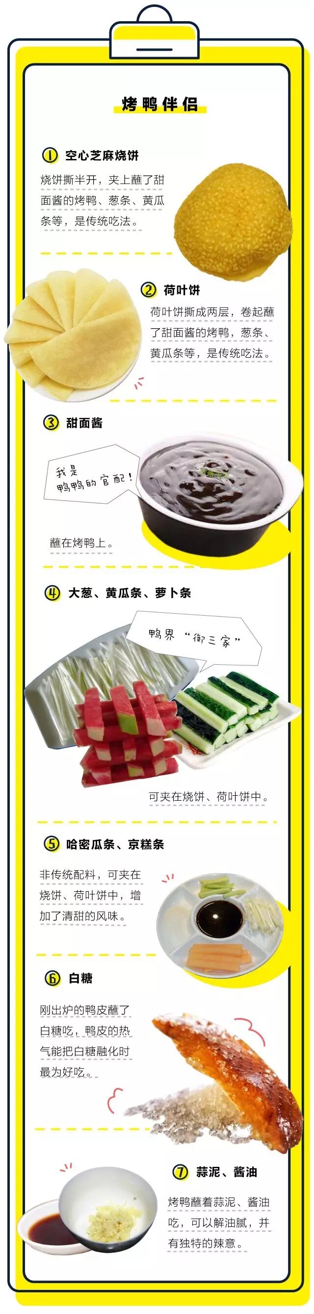 因为对烤鸭爱得深沉,他们吃烤鸭,自有一套讲究。白糖也好,黄瓜条也罢,在北京人民的心中,羊角葱+六必居甜面酱是吃烤鸭的标配,荷叶饼和芝麻空心烧饼是衡量一家烤鸭店水平的关键指标。