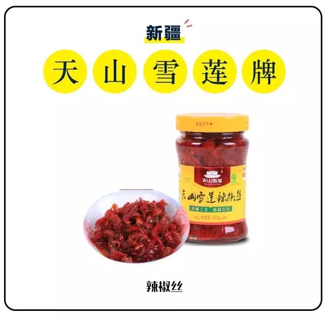 原本以为酱这种东西只属于内陆地区,没想到,在新疆这种只吃馕、面、肉的地方,天山雪莲辣椒丝竟然能突破重围,成为小网红。这瓶辣椒酱辣中带甜,口味柔和,新疆天然的厚皮肉质辣椒自然发酵出甜味,完全可以空口吃。