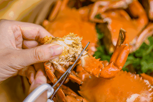 剪刀用来剪壳,汤匙用来挖蟹黄蟹膏,牙签用来挑蟹肉。不过吃着吃着可能就放弃了,毕竟不停转换工具有点累,何必呢?