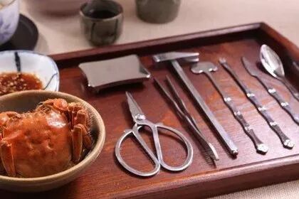 蟹八件是明代初创的食蟹工具,腰圆锤、小方桌、镊子、长柄斧、剪刀、长柄勺、刮片、针。