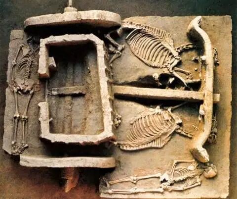 中国古代的家畜起源过程可以分为两种模式。一种是逐步控制驯化某类野生动物,把它变为家畜。另一种是在文化交流过程中从其他地区直接引进已经成为家畜的动物。中国早期的羊和马都是外来的,其中马的突然出现可能与马车的传入有关。图为河南安阳殷墟郭家庄遗址M52号出土的车马坑,它是中国目前发现的最早的车马遗迹。