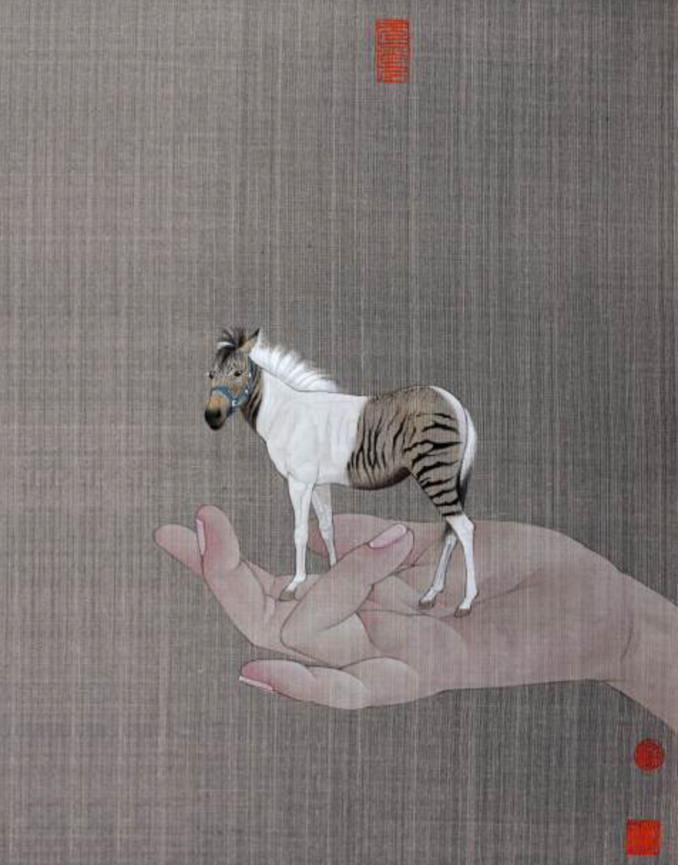 ▲ 掌中宝马。平日里见到骏马,大都是在草原之上纵情奔跑,而画家沈宁《生肖图册》中的这匹马却站立于伸出的手掌之中,构思立意,与众不同。大概这也正是人们养宠的心态,宠它爱它,将它当作掌中珍宝。绘画/沈宁