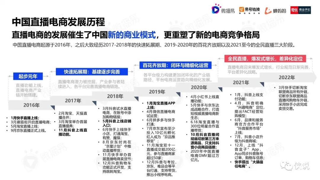 中国直播电商起源于2016年,之后大致经历2017-2018年的快速拓展期、2019-2020年的百花齐放期以及2021至今的全民直播三大阶段。
