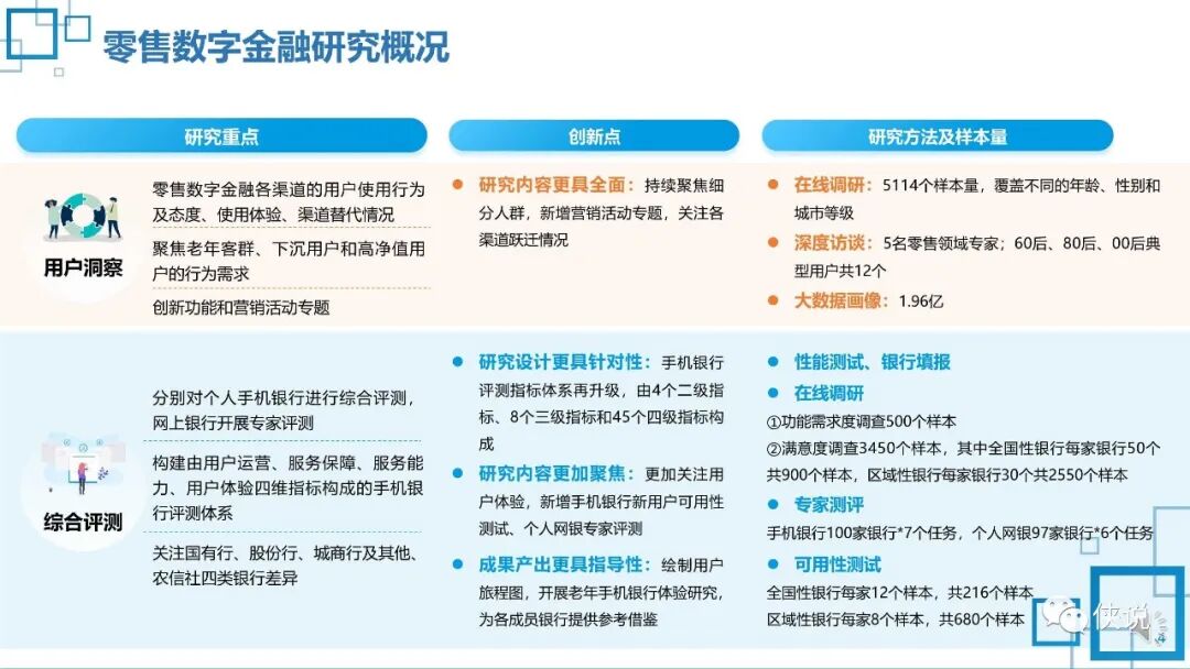 《报告》共包括三大篇章,分别为:零售数字金融用户行为态度及综合评测、企业数字金融用户行为态度及综合评测和数字金融转型研究及综合评测。