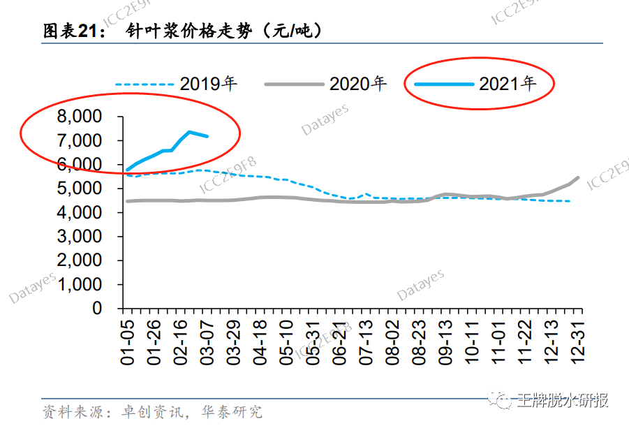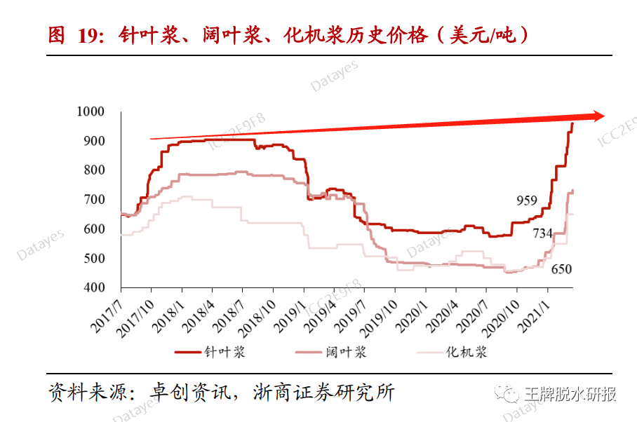 供应端纸浆价格持续上涨:未来两年针叶木浆新增产能很少。目前,针叶木浆价格已达到900美元/吨,预计2021年价格将达到1000美元/吨。在国内纸浆行业集中度不断提高的背景下,大企业话语权不断提升,纸浆价格上涨会推高纸张价格。