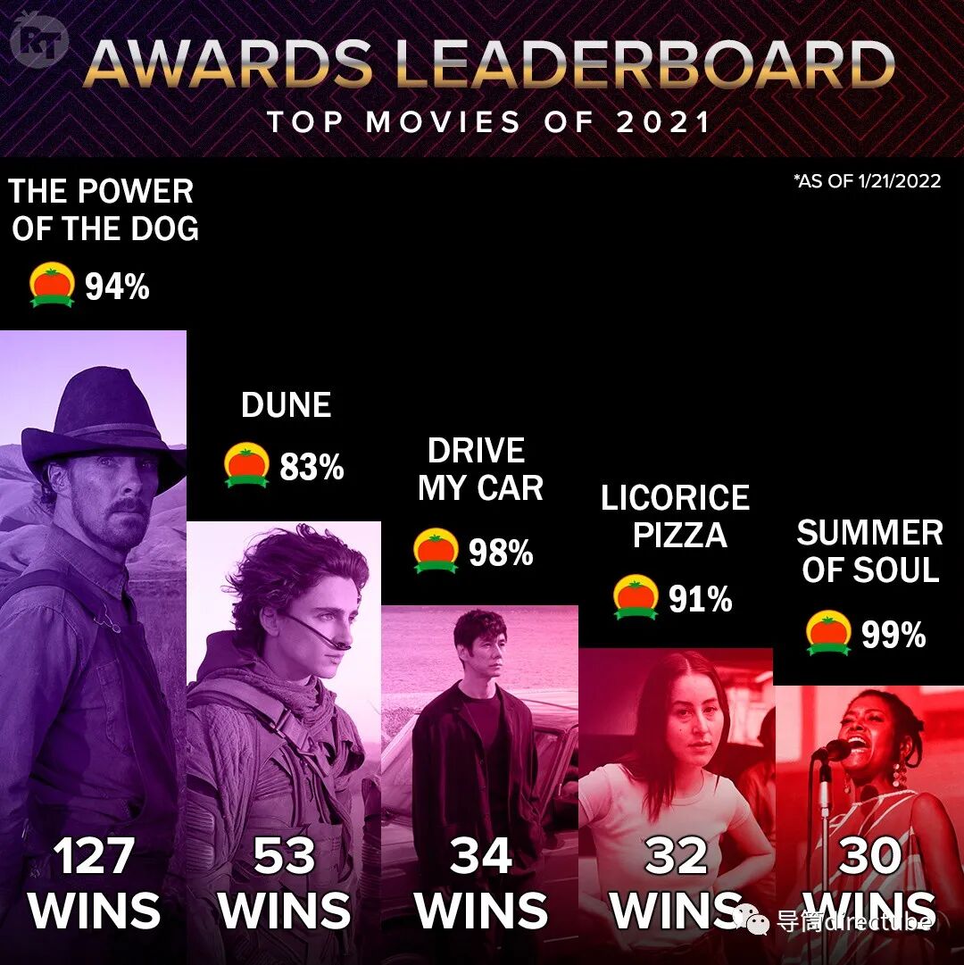 烂番茄网站选出全球范围颁奖季获奖数最多5部电影(截止2022年1月21日),《犬之力》断层第一,继续领跑。