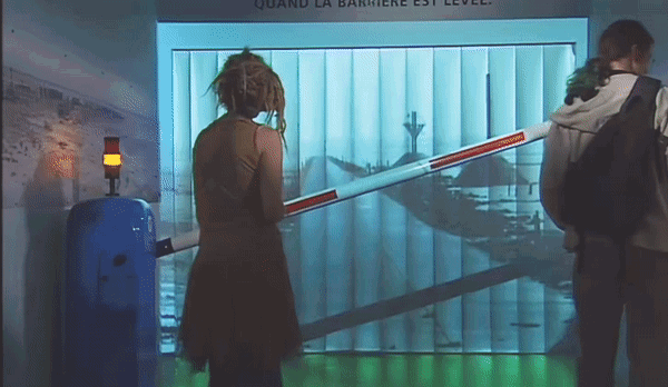 瓦尔达以这条通道为原型创作了装置作品《格伊斯通道》。透过半透明的窗帘,我们隐隐约约可以看到视频投影中海水时高时低起伏着。它像是展览的一个入口,只有当视频中的海水退潮时,门帘和横杆才会升起,打开这条道路,邀请观众们向前走去,穿过窗帘来体会小岛的真切。