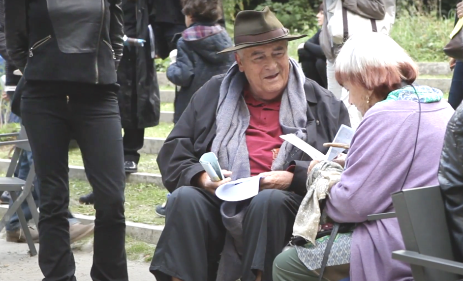阿涅斯·瓦尔达与埃尔维·尚戴斯(Hervé Chandès),不确定之夜“21世纪的阿涅斯·瓦尔达”现场, 2018年, 卡地亚当代艺术基金会,巴黎 图片 © Philippe Cap