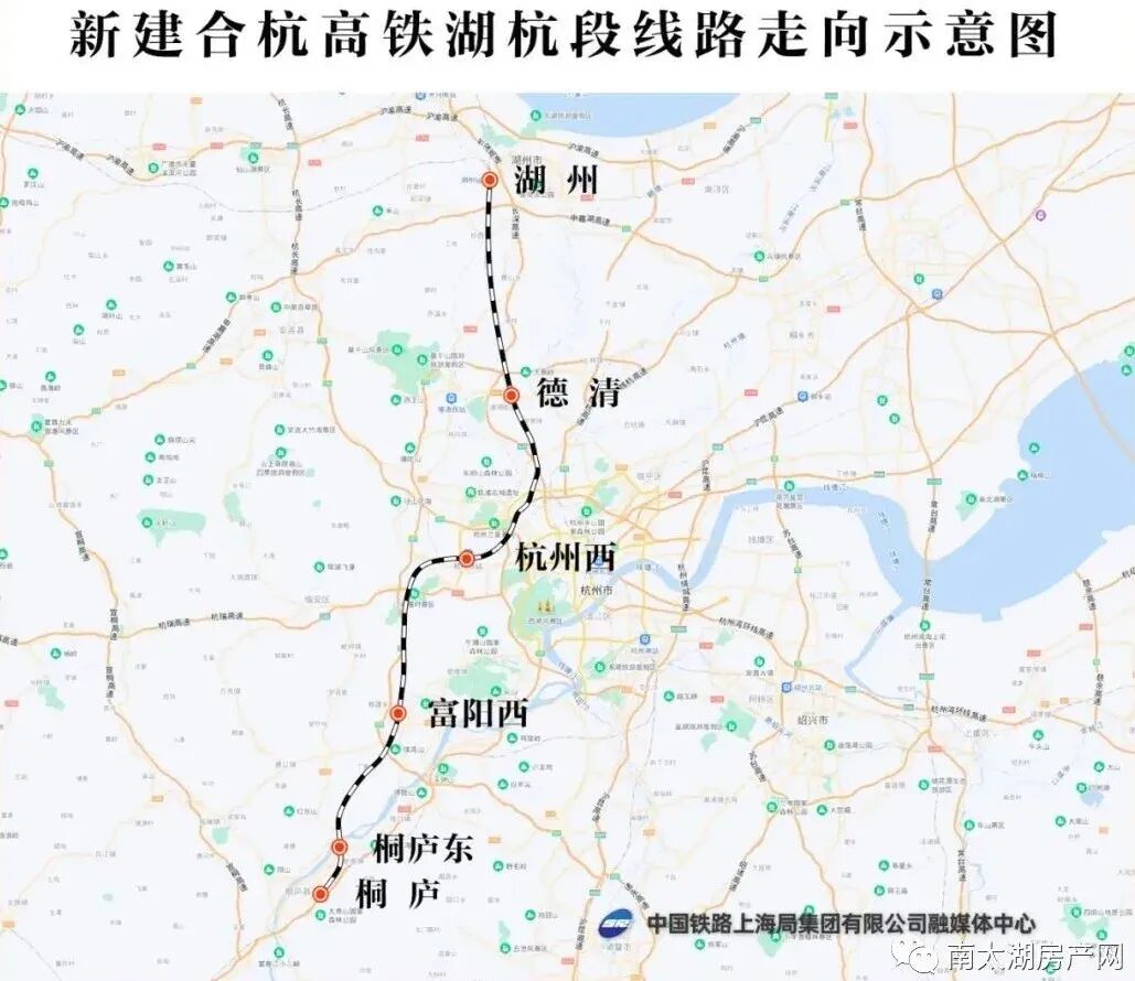 合杭高铁湖杭段是杭州亚运会重要交通保障项目,从既有湖州站引出,经湖州市南太湖新区、吴兴区、德清县,杭州市余杭区、西湖区、富阳区和桐庐县,跨富春江后引入杭黄高铁桐庐站,新建线路长约137.8公里,设计时速350公里,全线设湖州、德清、杭州西、富阳西、桐庐东、桐庐6座车站,其中杭州西、富阳西、桐庐东为新建车站。