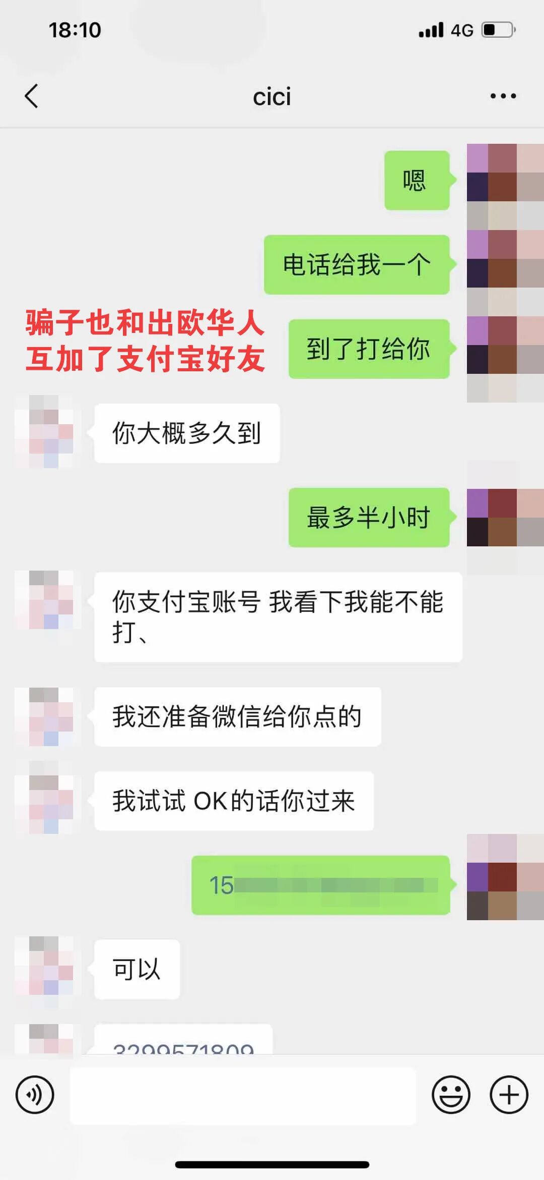 骗子在微信群里分别加了一个出rmb的留学生和一位出欧的华人,分别加了对方的支付宝。