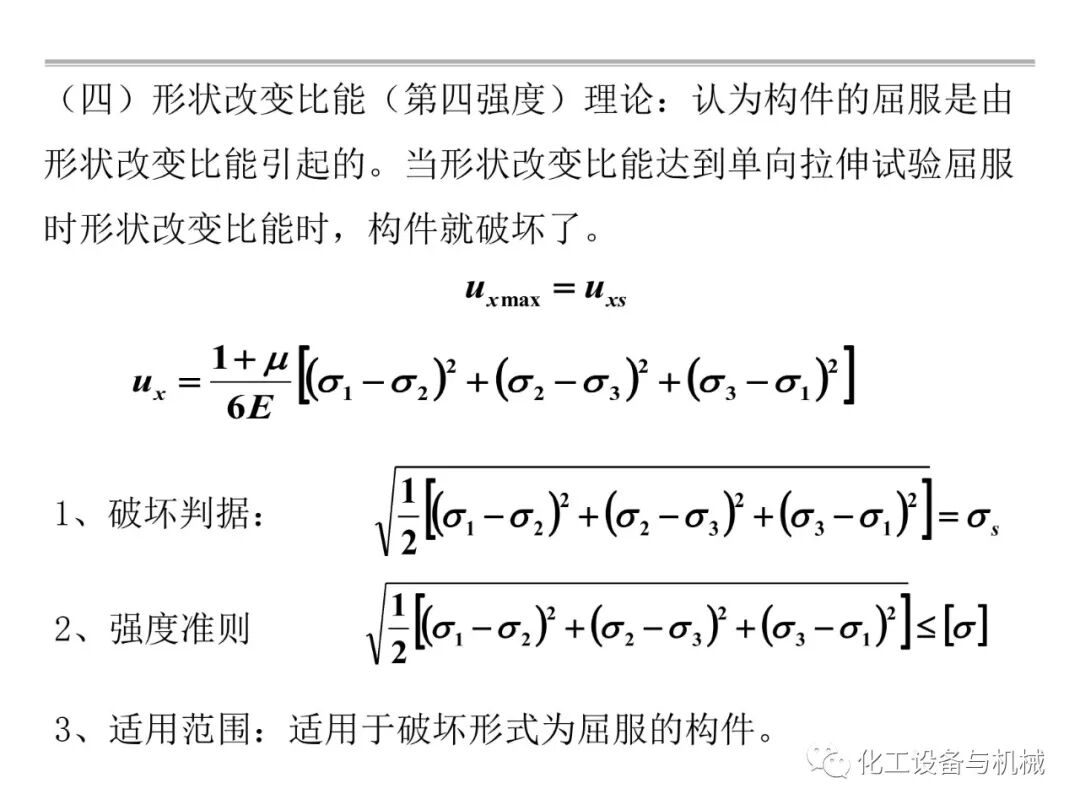 第四理论:畸变能密度理论,适用于大多数塑性材料,比第三准确,但不如第三方便。第四强度理论又称最大形状改变比能理论。该理论适用于塑性材料。