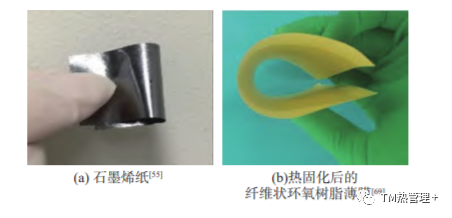静电纺丝技术是一种制备纳米/亚微米级材料的特殊方法,因其方便、灵活、操作简单等特点,在制备亚微米/纳米级材料方面受到广泛关注。木质纤维素、高聚物、复合材料、半导体材料、陶瓷材料等很多种材料都适用电纺丝法。静电纺丝技术也可以用于制备导热纸。Zeng等人报道了一种以环氧树脂为原料,通过静电纺丝技术成形的柔性纤维外延基板,具有优异的柔韧性、高导热性和低介电常数。材料热导率可以通过改变纤维的直径来调节,可达0.8W/(m·K),比旋涂成形的浇铸环氧树脂基板高 3 倍。这归因于静电纺丝过程中形成的聚合物分子链排列和纤维结构。该薄膜如图 4(b)所示。谭岑孝利用静电纺丝并结合抽滤和旋涂的方法,以电纺热塑性聚氨酯弹性体橡胶 (TPU) 纤维膜作为支架,并以石墨烯纳米带和BNNS分别作为导电和导热的活性材料,制备了基于层压纳米复合材料的柔性可拉伸传感器。该材料 (BNNS质量分数 30%) 热导率为1.076 W/(m·K),与纯 TPU 层的热导率 0.404 W/(m·K)相比,提高了266%。