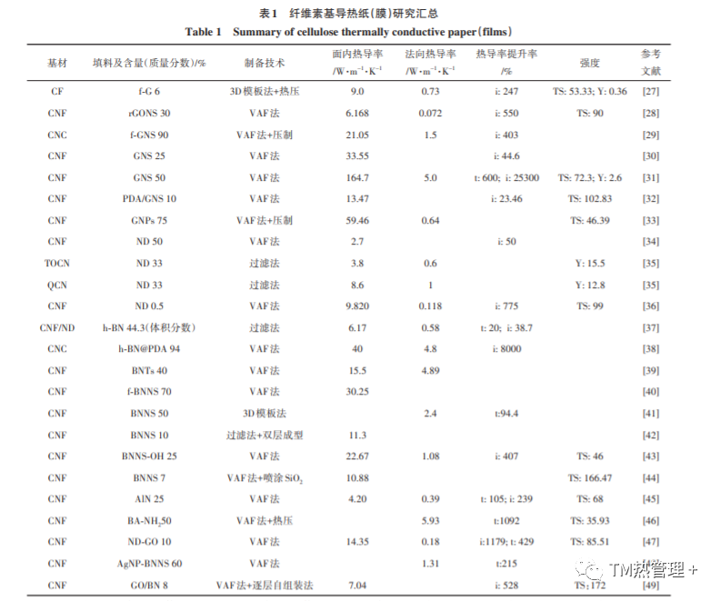 表 1 总结了 CF 基导热纸 (膜) 的基材、填料的类型和比例,制备方法,面内和法向热导率及强度,基材尺寸,填料类型、含量、表面修饰,以及制备方法均能对材料的热导率产生影响。目前 CF 基导热纸(膜) 研究中关注材料面内热导率的较多,且一般面内热导率高于法向热导率。在本文参考的研究中,大 多数研究者采用的测试热导率的方法为激光闪点法,少数研究采用了稳态法和瞬态平面热源法。在激光闪点法中,大多数使用的是德国 Netzsch 公司的激光导热系数测量仪,仅几项研究中使用了日本Bethel公司的导热性测定仪 TA3/TA33及德国 Linseis 公司的激光导热仪 XFA300。采用的测试温度多在 25℃。有相当一部分研究者在提高材料热导率的同时也在关注材料的机械性能。