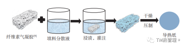 将纳米纤维素 (NC) 制成气凝胶,导热填料在溶剂中分散均匀,将 NC 气凝胶放置于填料分散液中,让导热填料灌注到 NC气凝胶内,然后通过压光得到导热材料[9](见图 2)。将导热填料制成气凝胶,NC制成分散液同样适用 。