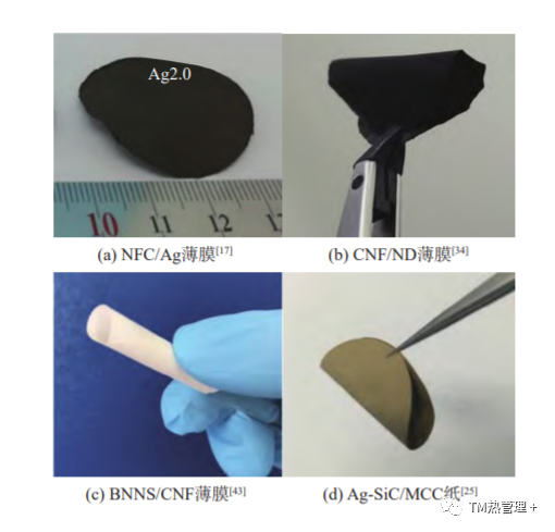 金属是良好的导热材料,添加金属填料可改善材料的导热性能。一般用于改善导热性能的金属填料有铝、铜、银、金等。目前,金属填料应用于聚合物复合材料中较多,应用于 NC复合材料中较少。金属填料除了是热的良导体,也是电的良导体,会增强复合材料的导电性。此外,添加金属填料,还会增加复合材料的密度及氧化腐蚀的概率。Shen等人通过银纳米粒子在 CNF 上的原位合成和 VAF 法制备了 CNF/Ag复合膜。Ag 纳米粒子的修饰使复合膜很容易形成导热通路,含 Ag 体积分数仅为 2.0% 的薄膜显示出 6.0W/(m·K) 的高面内热导率,是纯 CNF 薄膜的 4 倍。此外,复合膜表现出相对较高的强度和柔韧性。Ito等人制备了 TEMPO氧化纳米纤维素/银纳米粒子(TOCN/AgNP) 复合材料。AgNP 是通过 Ag+螯合到TOCN的羰基上,然后在水分散体中还原形成。通过过滤法获得 TOCN/AgNP 膜。TOCN/AgNP 复合材料(AgNP 体积分数 30%)的面内、法向热导率分别为4.8 W/(m·K) 和 1 W/(m·K),CNF/Ag 薄膜如图 3(a)所示。