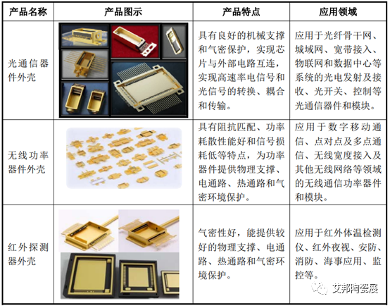 通信器件用电子陶瓷外壳产品主要包括光通信器件外壳、无线功率器件外壳、红外探测器外壳, 各产品的特点及应用领域如下: