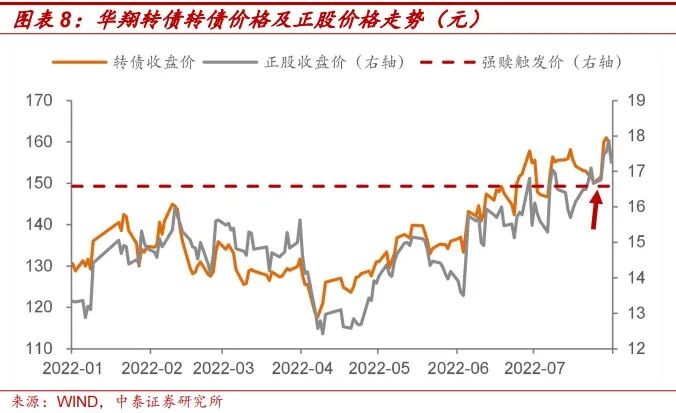 截至8月19日收盘,华翔转债存续期还剩5.34年,未转股余额为8.00亿元,未转股比例达到99.98%,正股股权无质押,若强赎将对正股价格造成较大的压力;此外,公司控股股东华翔实持有占发行总量的32.16%的转债数量,此时强赎不利于控股股东变现综合考虑,华翔转债此次强赎可能性不大,目前主要关注正股价格是否会回调至强赎触发价下,届时发行人促使转股的意愿将催生短线博弈的机会。