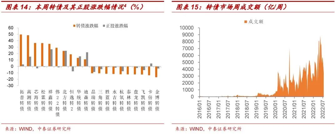 本周中证转债指数较上周下跌0.29%,报收425.16点。从个券表现来看,整体涨跌互现,其中涨幅前三的是拓普转债、高测转债和芯海转债,涨幅分别为49.67%、48.52%和36.45%;跌幅前三的分别是金博转债、卡倍转债和飞凯转债,跌幅分别为16.87%、13.78%、12.69%。本周转债市场成交金额为3467.74亿元,较前一周下降16.90%。