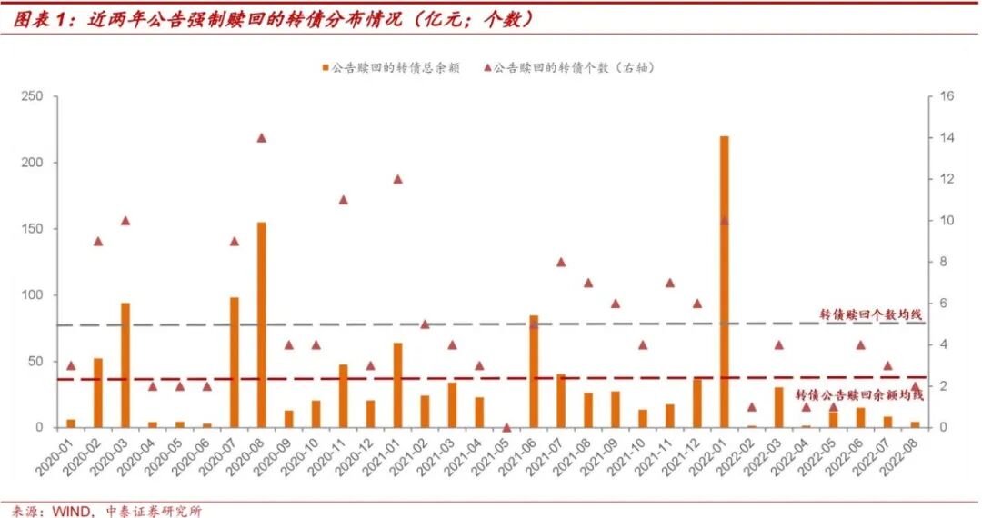 2020年以来(截至2022年8月19日,下同),共有165只转债标的公告强制赎回,其中有26只转债标的是在2022年1-8月提前赎回,且集中在1月。以赎回公告日为准测算转债标的余额,2022年1月,公告强制赎回的转债标的总余额达到219亿元,为近两年强赎规模最大的月份。