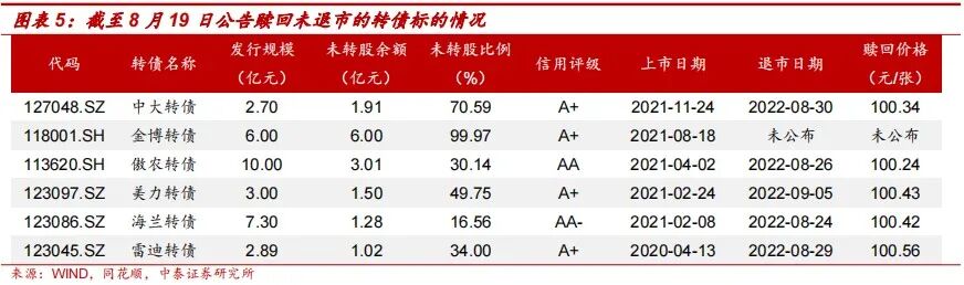 截止8月19日,未退市转债中,已经触发强赎条款,且发行人发布强赎公告的转债有6只,分别是海兰转债、傲农转债、美力转债、雷迪转债、中大转债和金博转债。不过,该6只转债标的未转股规模不大,我们预计转股压力对正股影响较小。