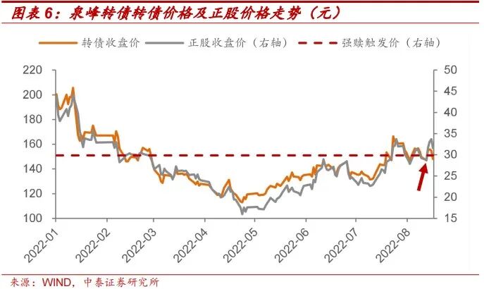 泉峰转债于2022年3月22日进入转股期,赎回条款的触发条件为:15/30,130%,截至8月19日收盘,正股股价在19个交易日中已有14个交易日高于赎回触发价,只要在剩下的11个交易日中有1个交易日正股股价高于赎回触发价,便可触发强赎条款。