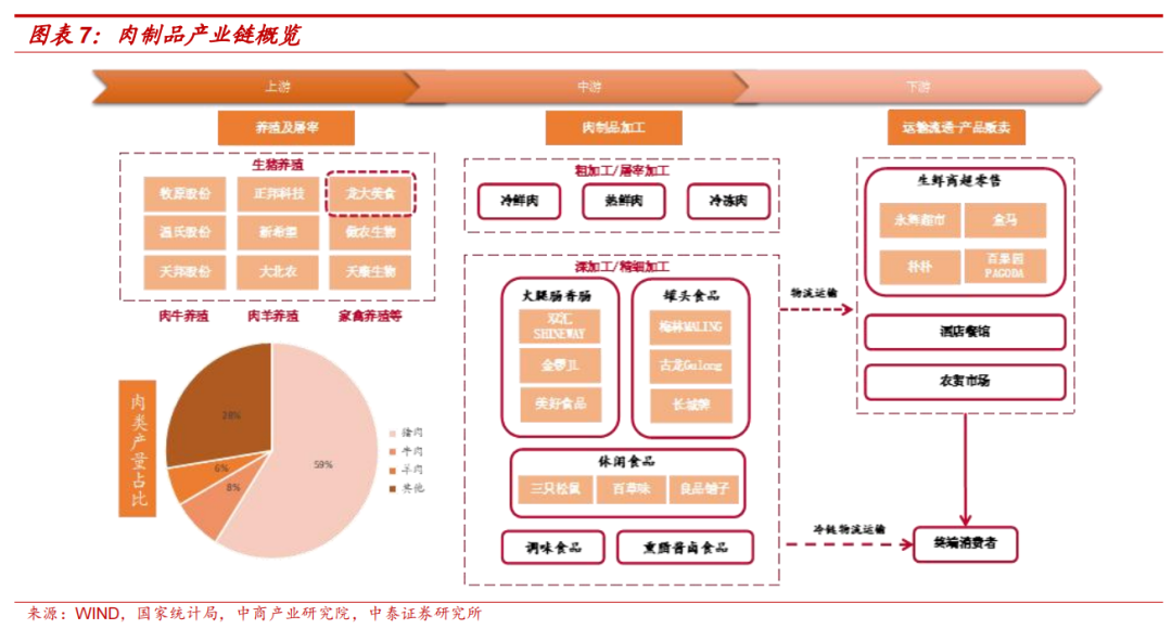 从肉类加工行业产业链来看,我国肉制品行业产业链主要包括上游禽畜养殖,中游屠宰加工以及肉制品的加工,再经过冷链物流运输等链条,肉制品最终到达消费者终端。