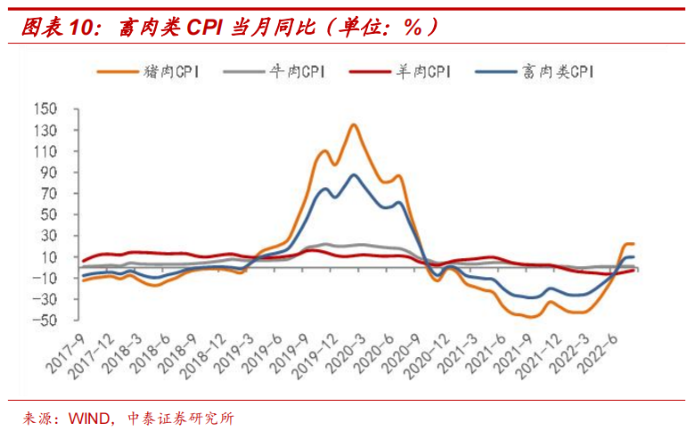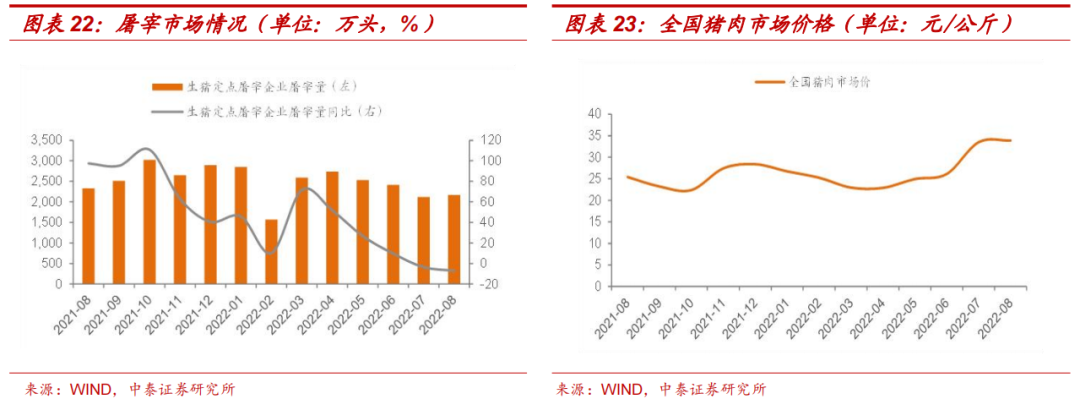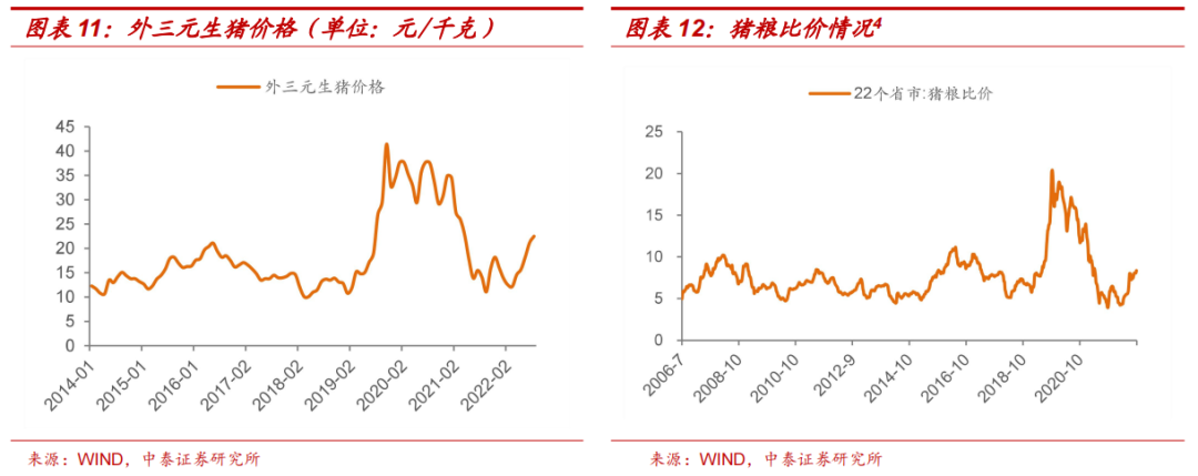 猪粮比价回升,成本端压力缓解。截至9月30日,22个省份的猪粮比价已回升至8.36的水准,处于养殖利润较好的绿色区域。与本轮周期中猪粮比价的最低位4.11(21年10月28日)已经翻倍,俄乌事件导致的饲用粮涨价压力有所缓解,养殖亏损带来的生猪产能去化趋势不变,生猪养殖成本有所回落。