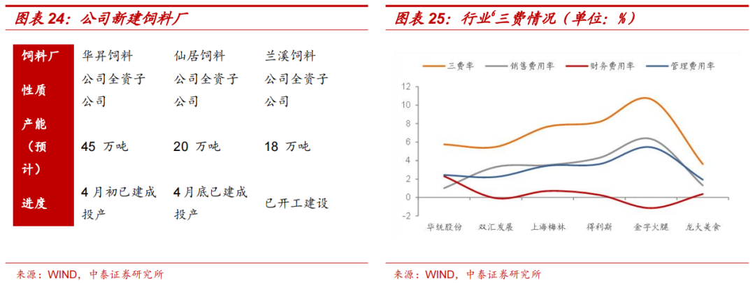 新建产能降低成本,提升经营效率。全资子公司华昇饲料、仙居饲料4月已建成投产,兰溪饲料正在开工建设。未来4个饲料厂共计总产能约为100万吨/年。公司通过饲料自给不但有利于降低畜禽养殖成本,还有利于从源头上控制生物安全,保证食品安全。目前生猪养殖完全成本16.74元/公斤,按照今年出栏120万头计算,三费为1.19元/公斤;满产之后三费是0.6元/公斤,产能利用率提升将推动三费逐渐下降。