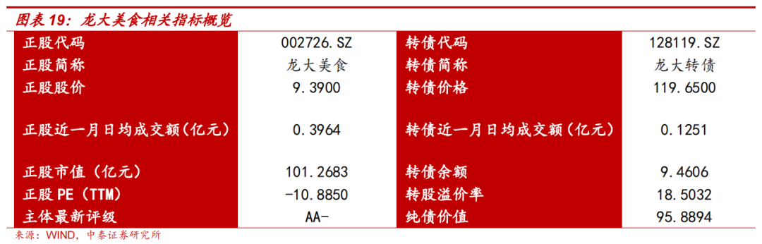 龙大转债:屠宰行业龙头发力预制菜细分赛道。龙大美食作为国内屠宰行业龙头,在2019年蓝润发展成为公司控股股东以后,转变经营思路,业务重心向食品倾斜,贯彻“以预制菜为核心的食品为主体,以屠宰和养殖为两翼支撑”的“一体两翼”发展战略。基于已有的客户资源,例如麦当劳、海底捞、西贝莜面村、五芳斋等知名餐饮连锁企业,有望屠宰养殖基础上开展进一步合作。截至2022年10月9日,龙大转债收盘价为119.65元,转债余额为9.46亿元,转债剩余年限为3.76年,转股溢价率18.50%,估值较低。