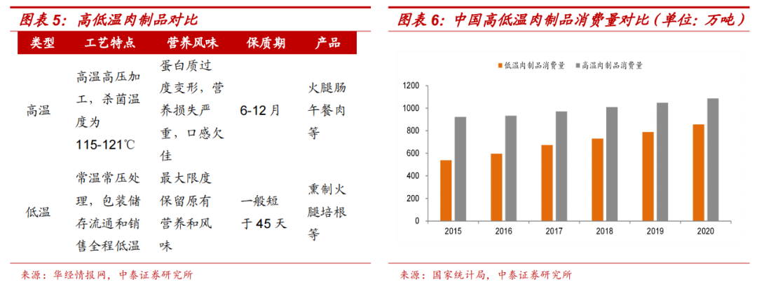 渠道变革带动消费升级,市场结构性变化愈演愈烈。电商渠道让易保存、易加工、安全健康、风味多样的肉制品加快流转,品类更丰富的肉制品出现在餐桌上。此外,虽然高温肉制品比较成熟,但面向餐饮和家庭餐桌消费的低温肉制品、调理肉制品、酱卤肉制品等半成品预制菜消费量因为餐饮租金人工费用高、年轻人厨房简单化而大幅增加,疫情期间涨幅加大。