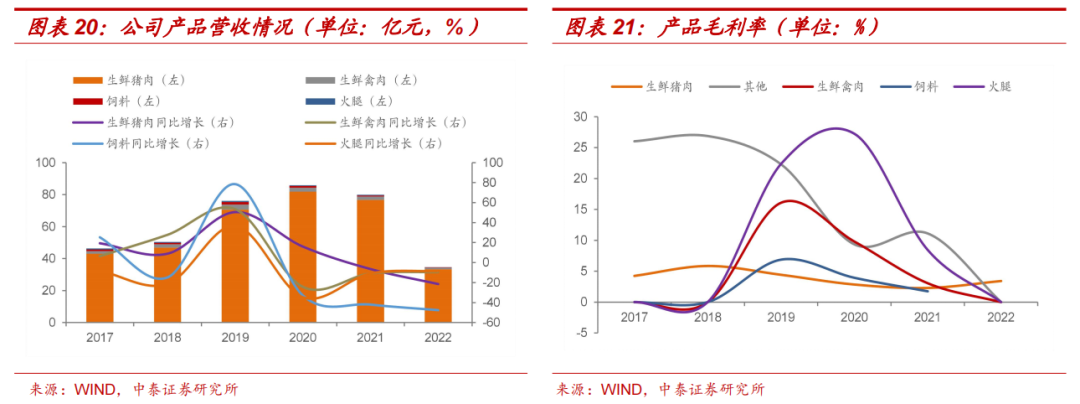 重新定位,淡化公司养殖属性,大力发展预制菜。公司结合自身屠宰与精加工的优势,以市场需求为导向,大力发展预制菜,与西华大学合作推动川式菜品创新,21年末已经储备新品100余款。公司在肉制品方面积累了很多大客户,有望在此基础上开展进一步合作,例如麦当劳、海底捞、西贝莜面村、五芳斋等知名餐饮连锁企业。2017-2021年公司销售毛利率保持在6.7%左右,相较于行业龙头双汇发展/金字火腿2020年15.35%/20.35%的毛利率水平还有提升空间,精加工肉制品的高毛利属性有助于公司补齐短板。