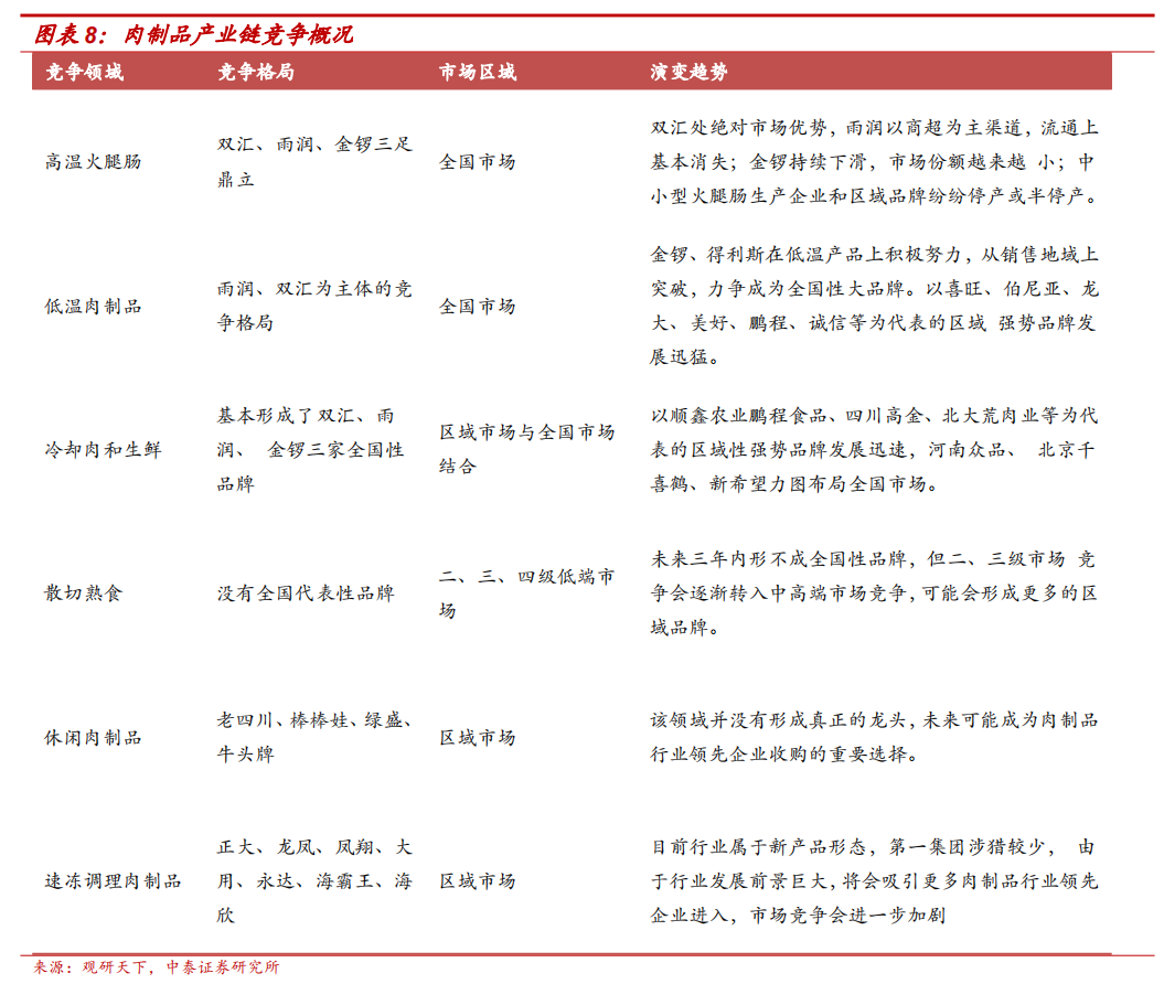 目前,我国的中式肉制品产业还处在区域品牌多而散3的阶段,产业集中度还很低,未来必将走向整合集中。在消费、产业双升级的趋势下,有产品、品牌、渠道、技术等综合优势的品牌企业竞争优势更为明显,在竞争中胜出的概率会更大。