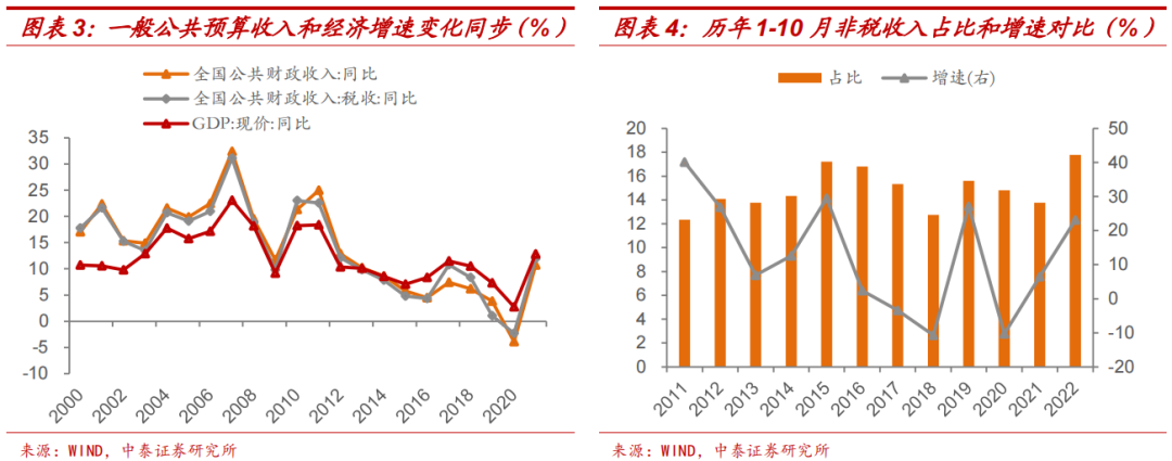 一般公共预算收入,特别是税收收入,和GDP名义增速有较高的相关性,2012年经济“新常态”以来,随着名义GDP增速中枢降至个位数,财政收入增长出现同步走弱。根据2000-2021年数据拟合得到的经验规律,名义GDP增速每下降1个百分点,财政收入预计下降1.57个百分点。今年1-10月,扣除留抵退税因素后税收收入同比仅增长2.4%,作为地方政府“开源”的优先选项,非税收入增速和占比显著上升。