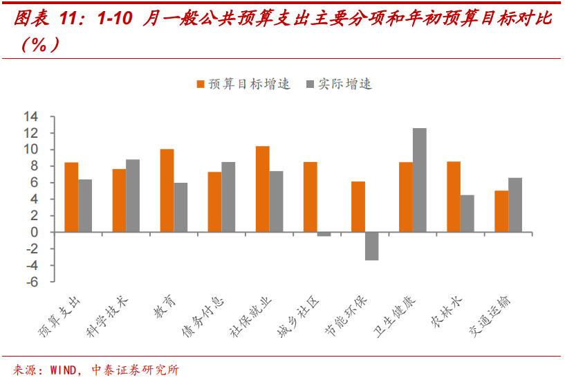 从今年以来一般公共预算支出情况看,截至10月底,累计增速为6.4%,低于年初设定目标(8.4%)。其中:卫生健康支出同比增长12.6%,较年初预算目标提高4.1个百分点,反映疫情防控支出成本的大幅上升;此外,除科学技术、债务付息、交通运输等分项外,其他主要分项均显著低于预算目标增速。