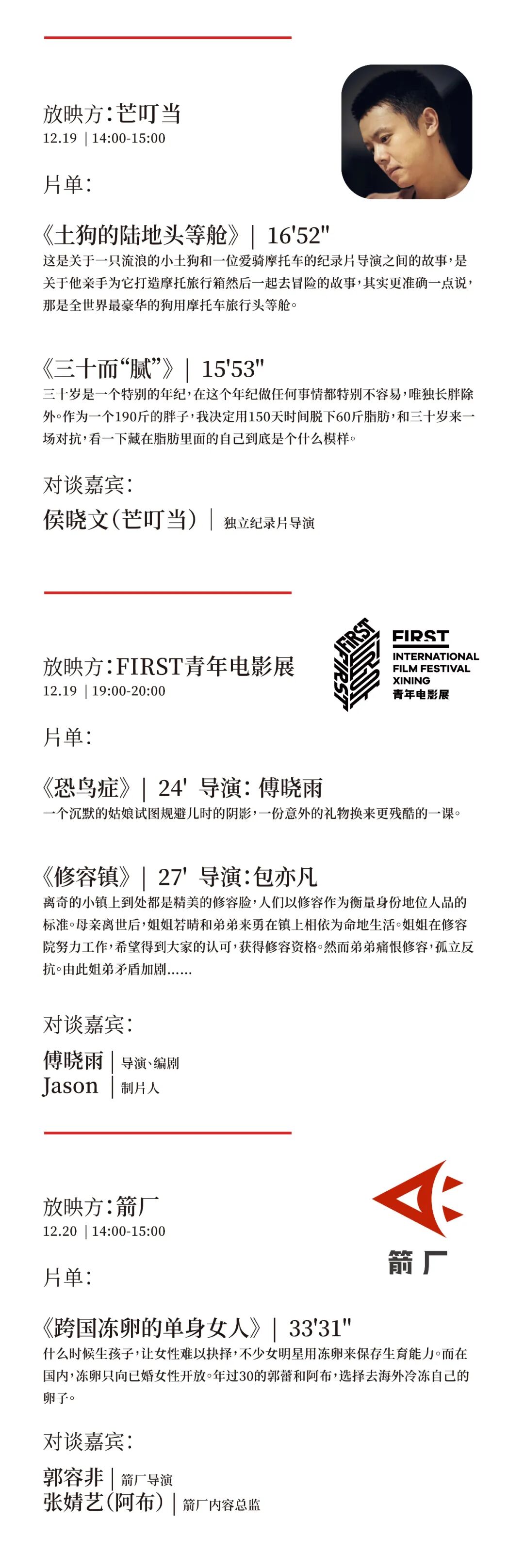 本次生活方式大会首次设置了“改变惊喜短片节”的影片放映及对谈环节。活动特邀FIRST青年电影展、费那奇北京动画周、箭厂、Figure以及独立纪录片导演侯晓文(芒叮当)作为此次短片节的故事嘉宾。在12月19和20日两天的5场放映活动中,他们将携各自的优秀作品来到现场,与观众一起聊聊有关影视创作与人物故事的话题。