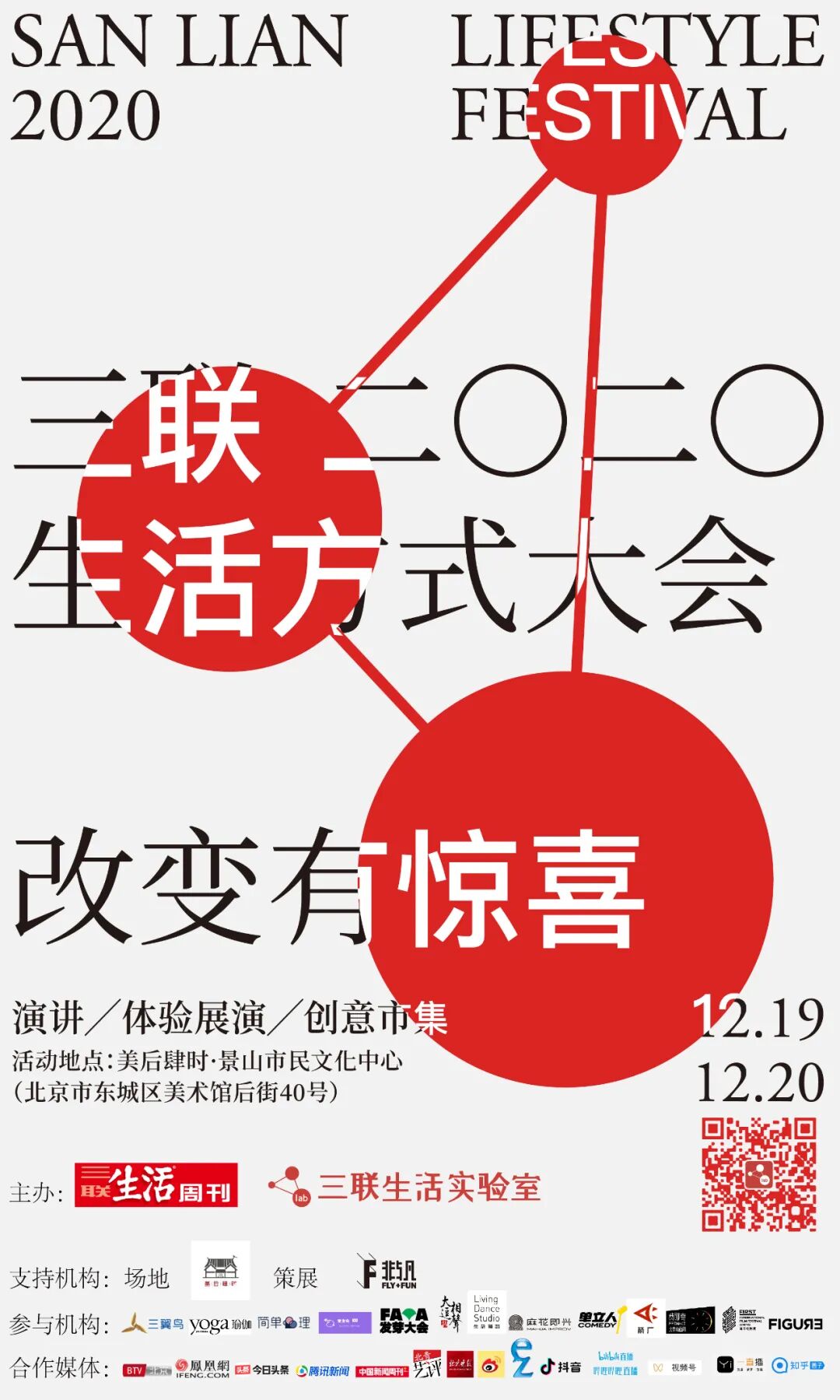 12月的19、20日,“改变有惊喜:三联2020生活方式大会”将在北京举行。两天的时间内,我们将奉上一场“改变有惊喜”主题演讲、三场“2020青话题”圆桌Battle,以及二十余场最潮生活方式体验,包括改变惊喜短片节、潮流瑜伽课、脱口秀演出、开心麻花即兴喜剧戏精工坊、简单心理疗愈工作坊、三翼鸟智慧烹饪、异次元电玩体验等。同时,我们还聚集了十余家生活方式机构,搭建起二十余家快闪店,组成创意年货嘉年华。活动的举办地在“美后肆时”空间,美美的两进四合院,容纳最美好的年度生活方式,等待与热爱生活的人相遇。