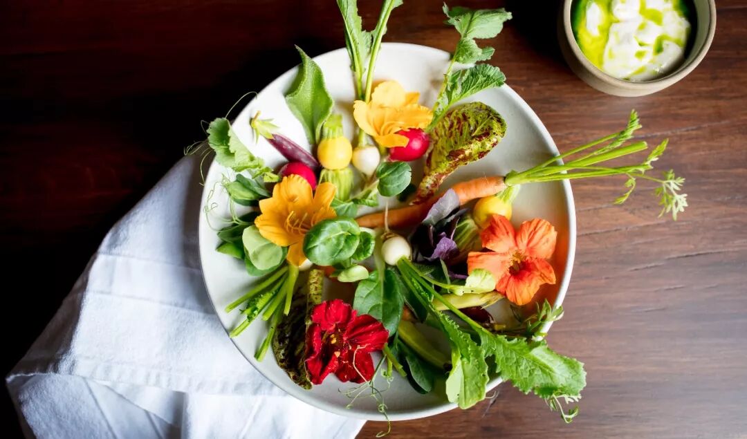 我们农场的新鲜蔬菜(Raw Vegetables From Our Farm)故名思义,是“农场到餐桌”运动的代表作,⼩萝卜、胡萝卜和菜叶被摆成有趣的形状,它的蘸料是用发酵的豆⼦制成的,散发出⼀种浓浓的乡⼟⽓息。