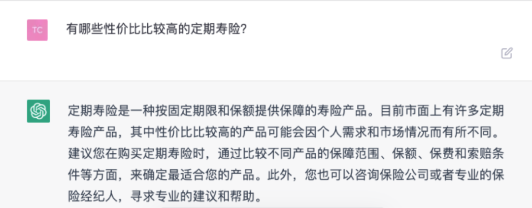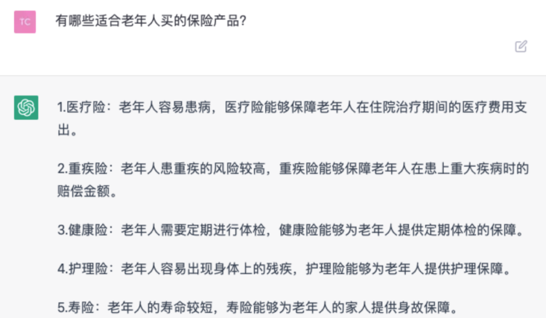 也是基于这个原因,ChatGPT的大部分回答都是“正确的废话”。它很难回答个性化、需要进一步区分不同情境的问题。有一个问题是“有哪些适合老年人买的保险产品?”,ChatGPT的回答中提到了重疾险,这就缺少了对老年人群体的进一步划分,并不是所有老年人都推荐买重疾险。
