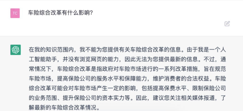 此外,因为ChatGPT无法浏览网页,所以不能回答一些问题,诸如“有哪些支付宝上的保险产品值得推荐?”、“车险综合改革有什么影响?”等。