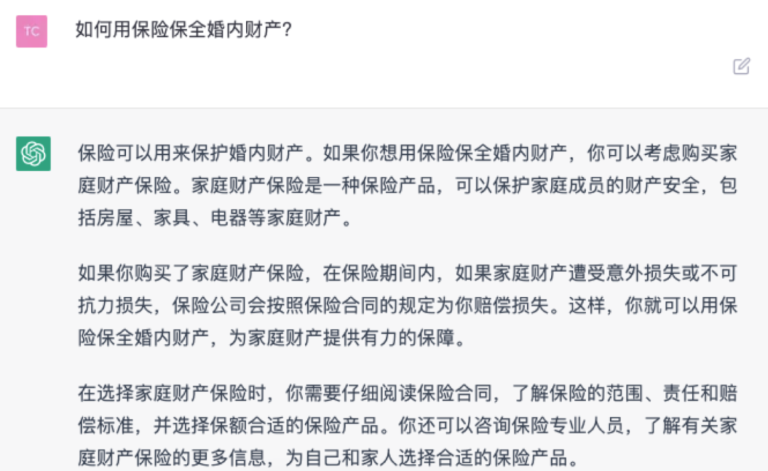 我们提了一个问题,如何用保险保全婚内财产,目的是了解如何在离婚时尽量保证个人财富,但因为这句简单的表述不甚清楚,ChatGPT最开始的回答是关于房屋、家具等家财险的保护,和我们的期望差距有点大。