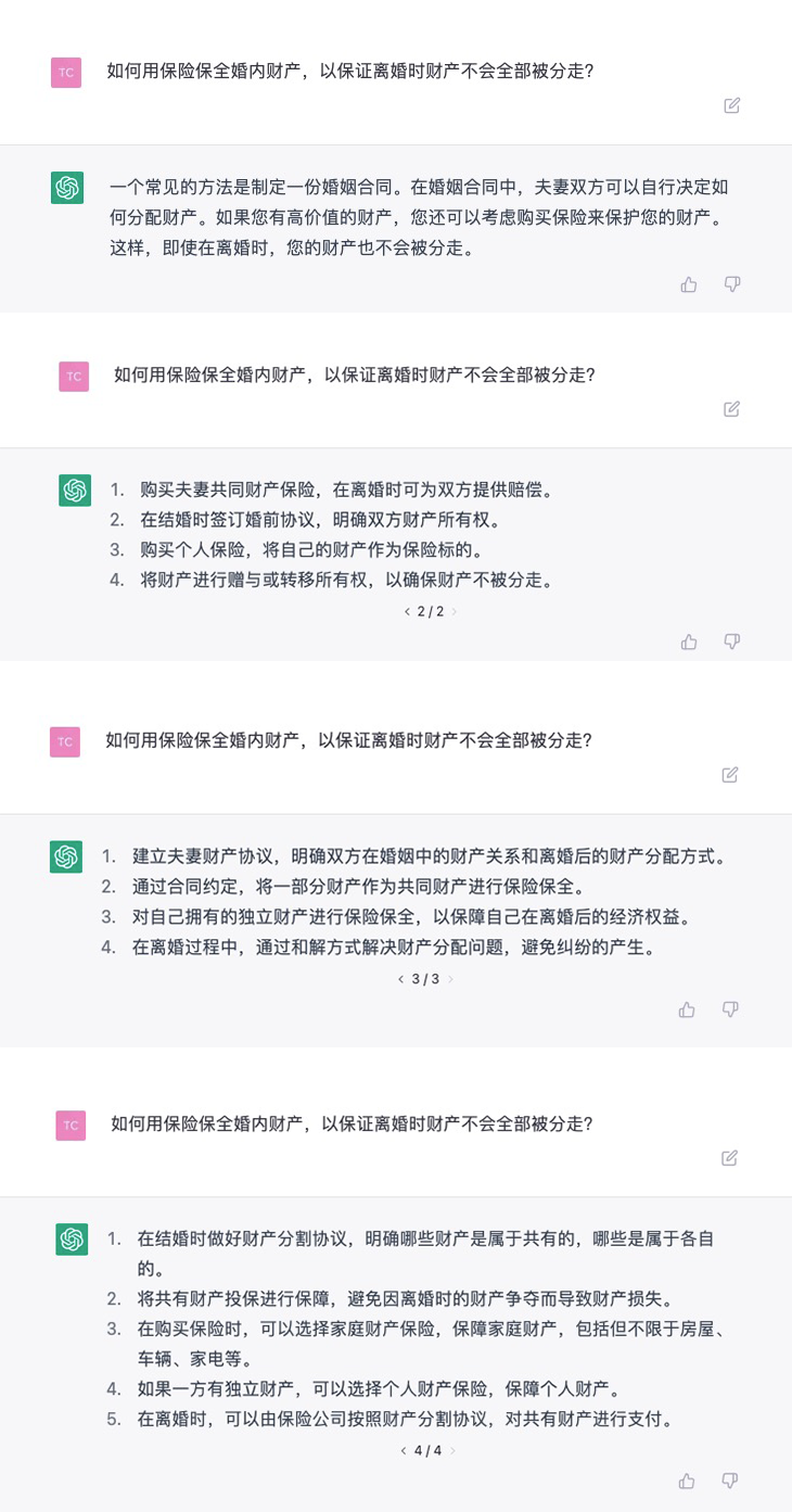 接着,我们补充了关于问题目的的描述,整个问题变成了“如何用保险保全婚内财产,以保证离婚时财产不会全部被分走?”,经过四五次反复提问后,ChatGPT的回答明显更接近我们的预期了,这一方面说明它对问题意图的感知较强而且可以根据意图的调整给出更匹配的回答,另一方面,对于同一个问题,它可以从不同的角度提供有些差异的答案。