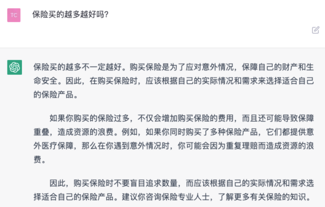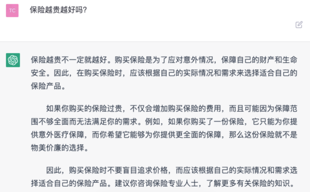 放在保险销售的场景,ChatGPT除了在专业性上比很多代理人表现更好以外,因为它是没有情绪、没有立场的机器人,有机会给出更公允的建议。除非因为语料训练不够、没有联网等原因而不知道准确答案,它是不会故意传递误导信息的。我们还问了“保险买的越多越好吗”、“保险买的越贵越好吗”之类的问题,ChatGPT的回答虽然算不上优秀,但至少还是比较公正的。