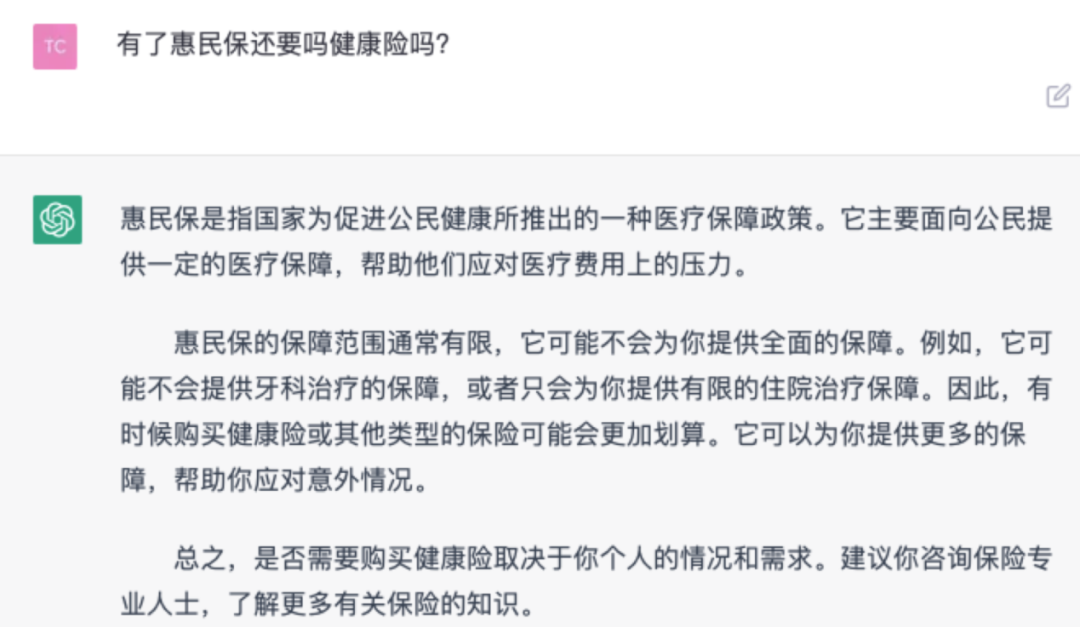 第二个问题在于,ChatGPT背后没有数据库,缺少结构化的体系。它的知识来自于输入的大量文本等资料,对一些概念会混淆,也就无法给出我们期望的答案,这个缺点在惠民保、医保等问题上都体现了出来。
