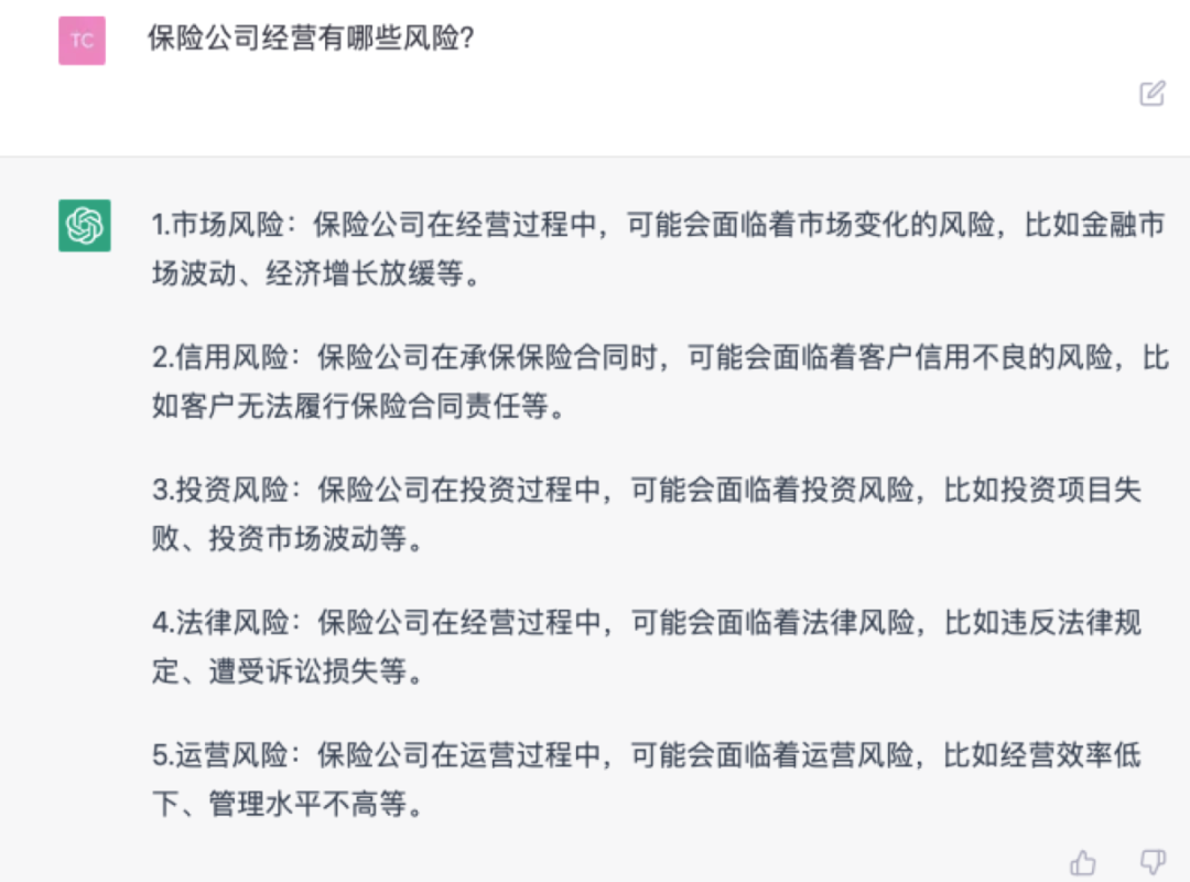 总结起来,ChatGPT在回答强逻辑性问题时表现更好,甚至可以好于一般的人类。例如,我们提了一个问题“保险公司经营有哪些风险?”,ChatGPT的回答如下图,虽然只是“点到为止”,没有展开进行更详细、有理有据的论述,但对于通用型机器人来说,这个回答的完整度还是可以的。