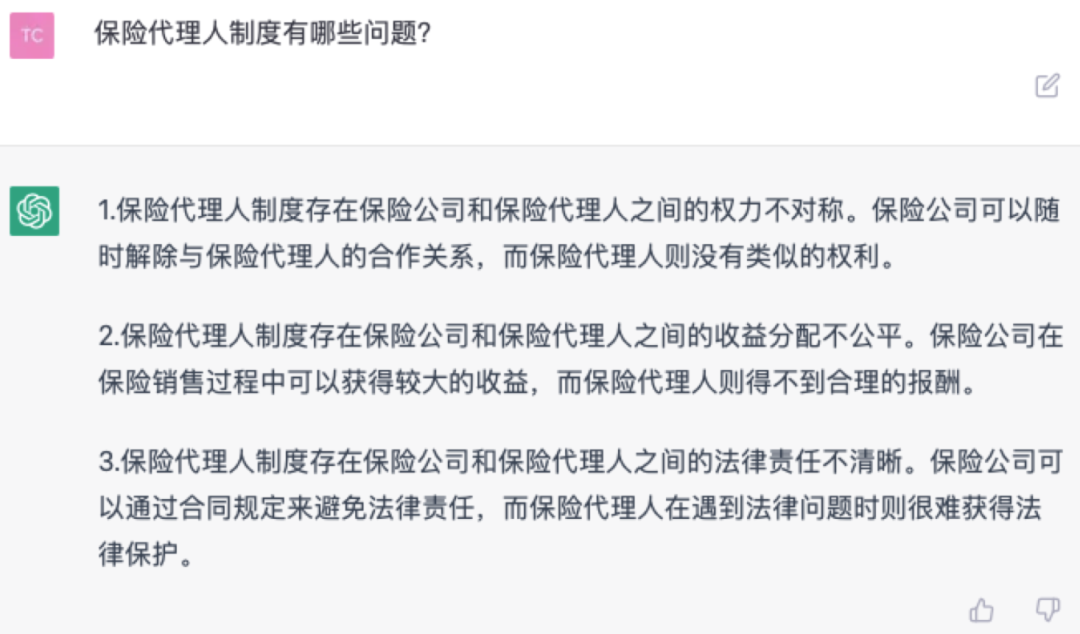 对于某些问题,ChatGPT的回答虽然不完善,但可以给人类提供一些新思路。关于“保险代理人制度有哪些问题”,一般人会回答代理人专业水平差、金字塔结构等,而ChatGPT更多考虑的是保险公司和代理人之间的生产关系矛盾。