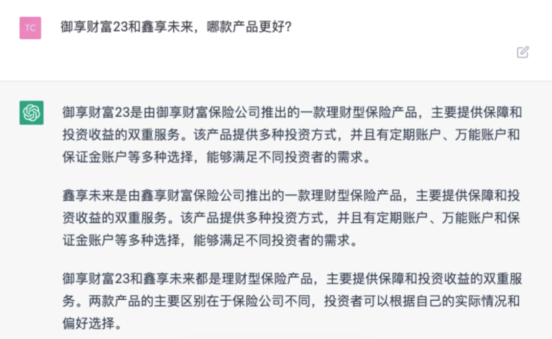 一是语义资料储存不够,也就是“喂”给ChatGPT的保险资料和数据不够多。一方面,ChatGPT的语义资料只“喂”到2021年,所以对今年的新产品、新事件“了解”不足。例如,有一个问题是“御享财富23和鑫享未来,哪款产品更好?”,这两款产品都是新出的开门红产品,超出了ChatGPT的知识范围,出现了明显的错误。
