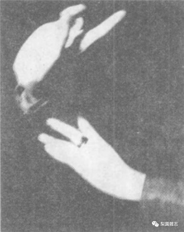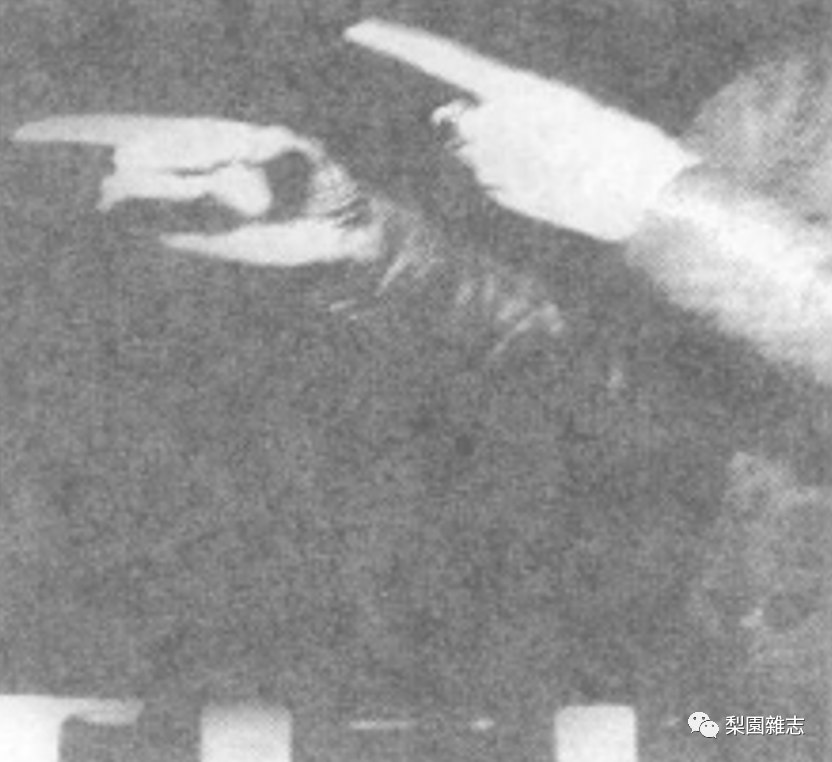 这还要感谢曲六乙先生,因为我拜读了他《三块瓦集》一书,“在印度时光隧道里”这篇文章后,启发了我从新拿起笔,来总结自己未完成的工作。从我拿着照片后,我未敢动笔,而是仔细地去悟王瑶老想通过这些手势告诉我们什么?真的是这样,怹的每一个手势,就是一个人物;也是一个典型动作,更是一出他的名典精作。例如图4、图8,他的手势是一种示意“三”的数字,但从表演上来分析,它的内涵不同。第一个是《拾玉锣》孙玉姣把手帕交给刘媒婆后,孙玉姣问:“啊,妈妈此去几天回音哪?”后,刘媒婆开玩笑告诉孙玉姣“三年”、“仨月”,最后告诉孙玉姣“三天”,这时,孙玉姣白:哦,三天?(图4)这掌心朝外,右手压腕、三指突出;身往后闪的身段,这是一种“讯问”急切的表示。